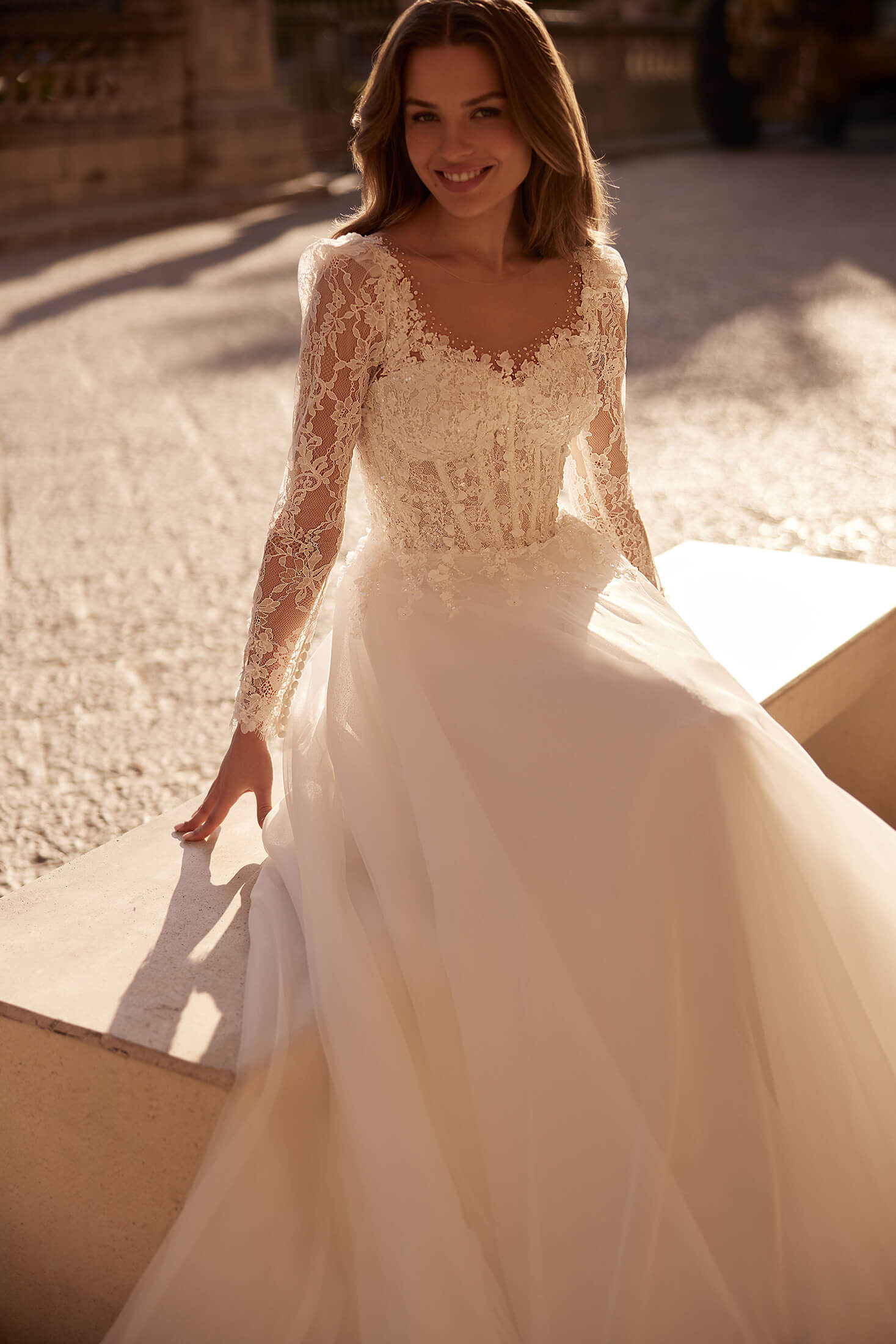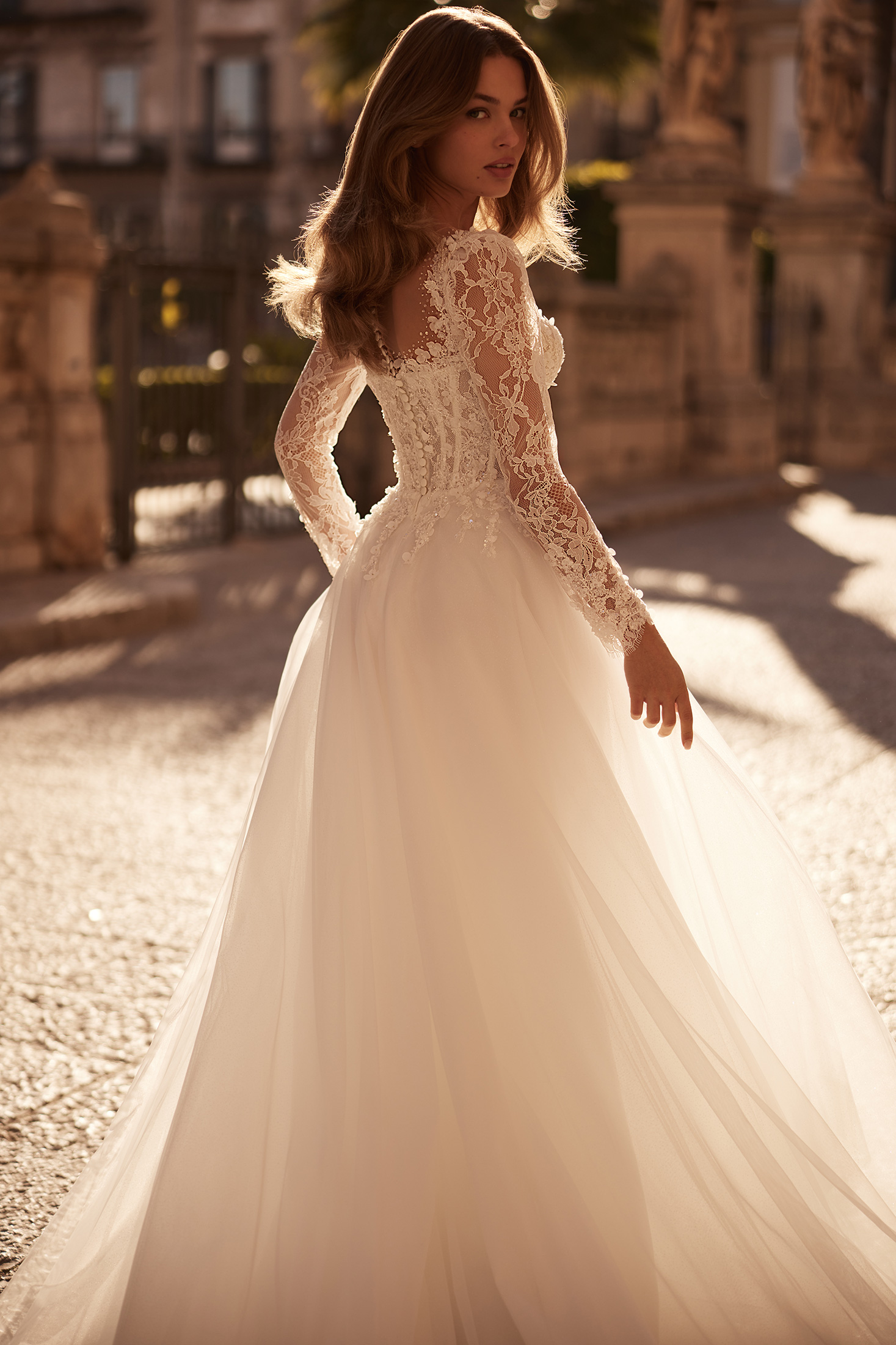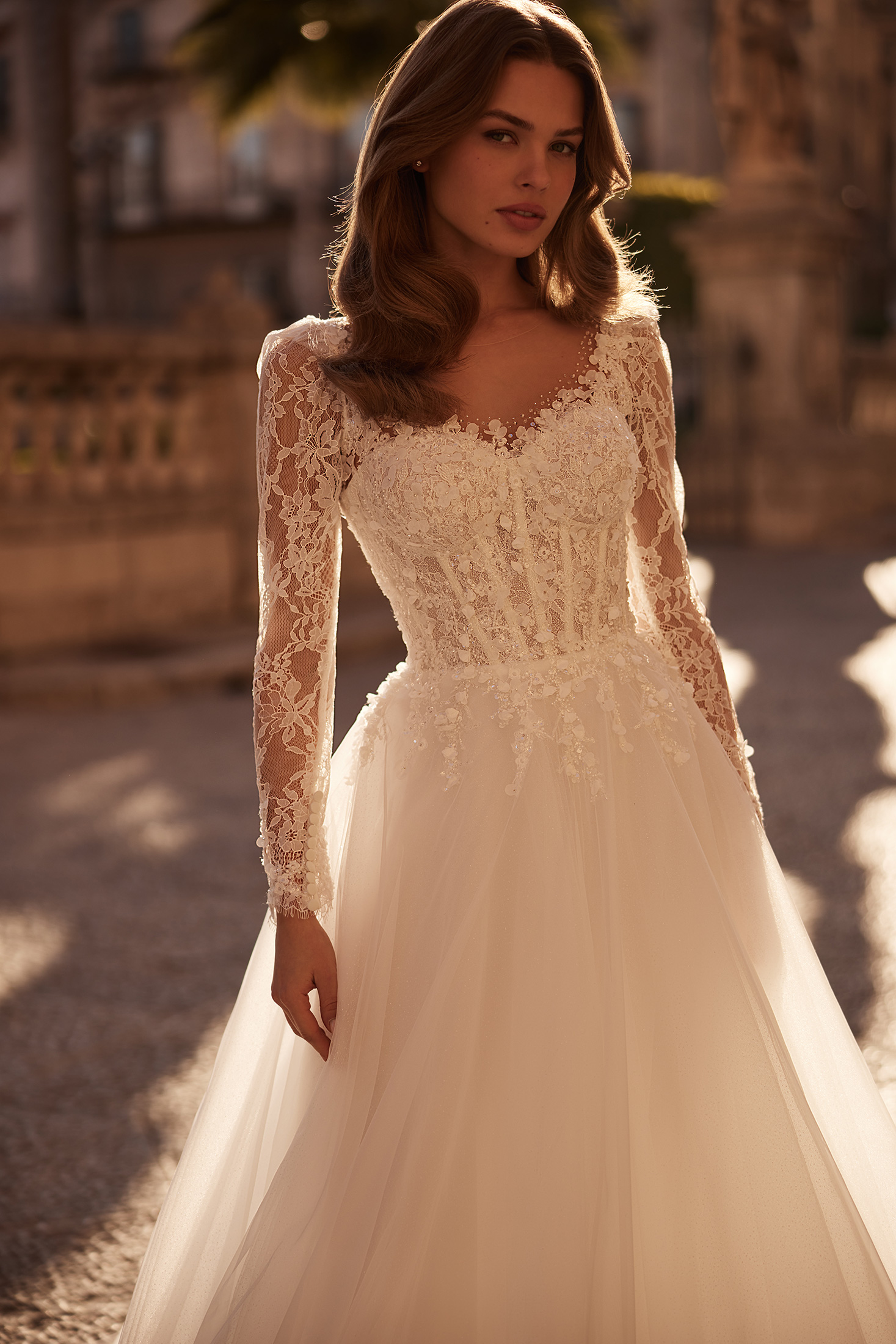 A romantic lace A-line wedding dress featuring a beaded bodice, illusion long sleeves, a softly glowing glitter tulle skirt, and an elegant sweeping train for a timeless bridal look.