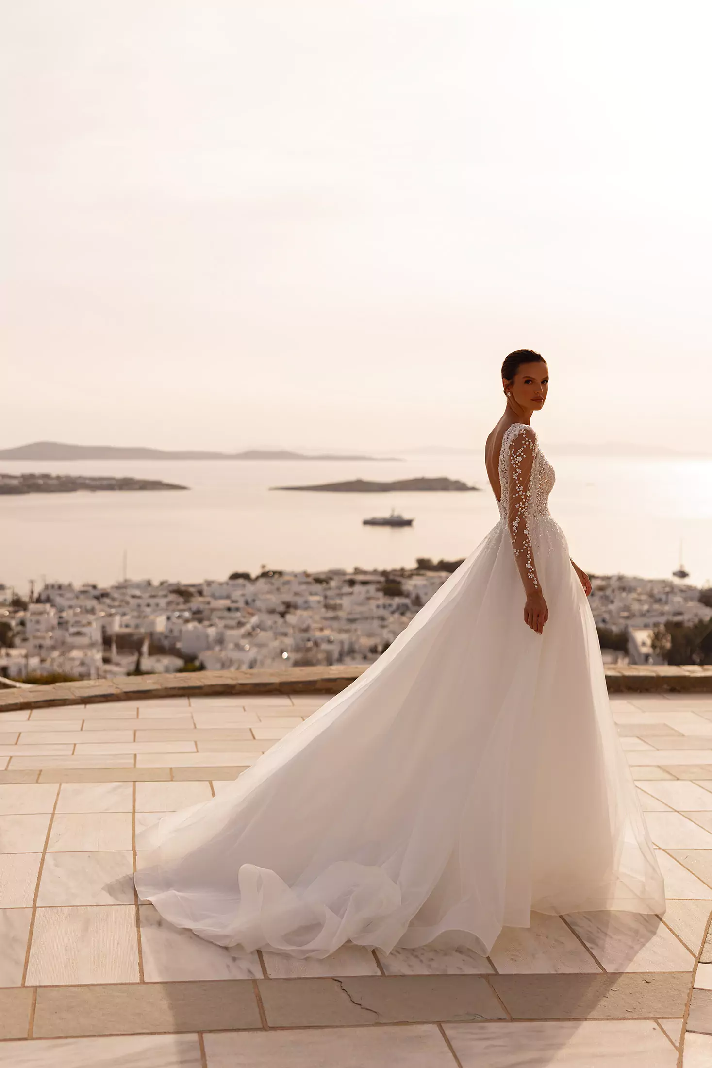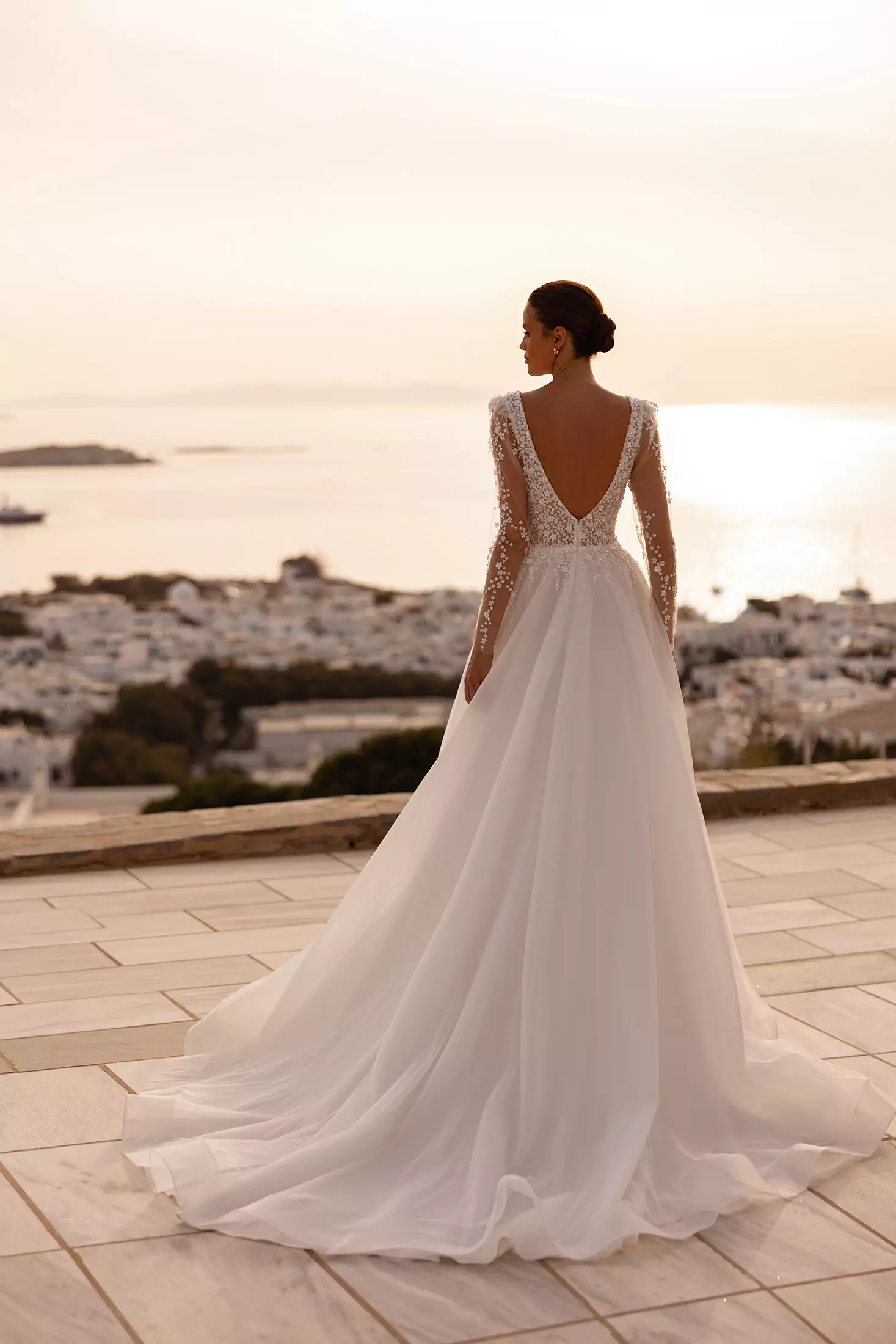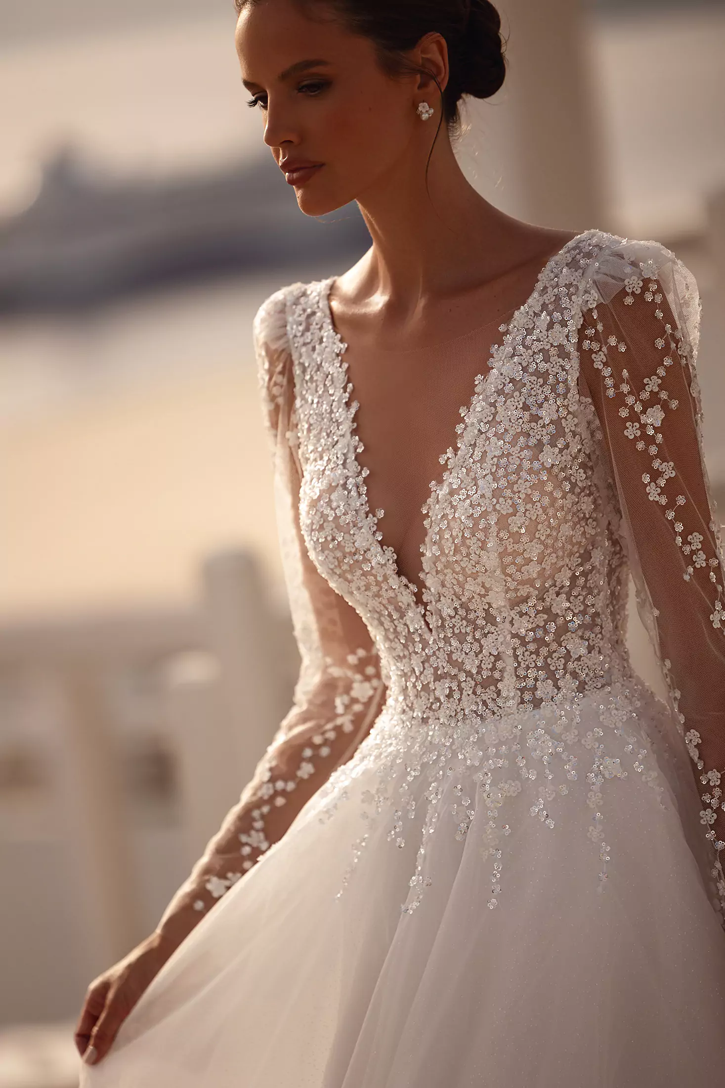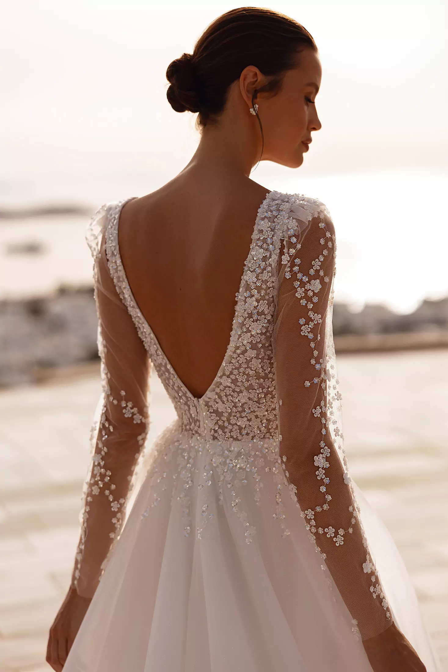 The Verona A-line wedding dress features a long-sleeved bodice with sheer sleeves, a V neckline, and a V backline, all crafted from sequined flower lace that elegantly flows over the waistline. The skirt cascades into a chapel train, hemmed with horsehair braid to maintain its shape. The dress blends classic elegance with modern sophistication, perfect for a timeless yet contemporary bridal look.