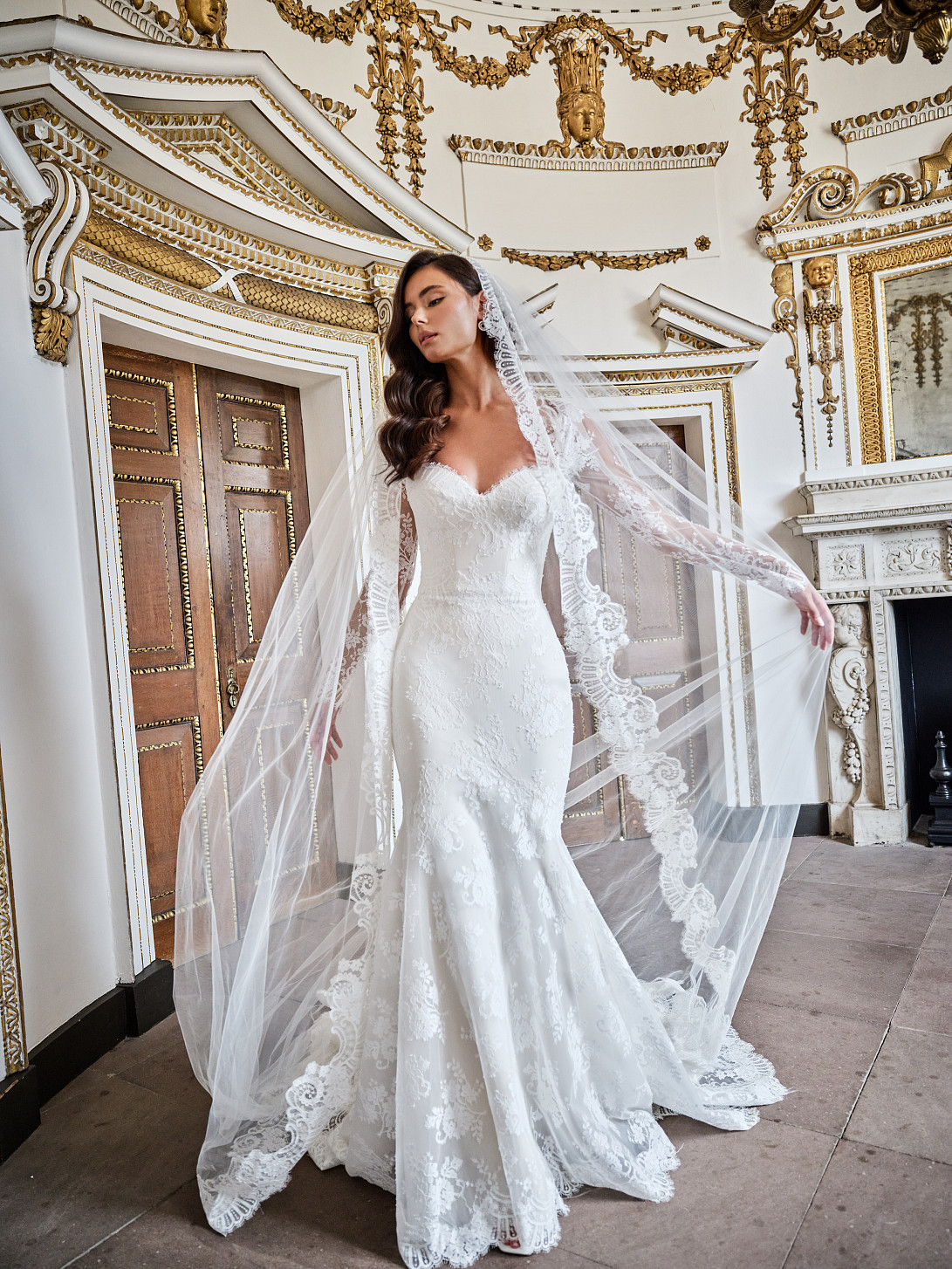 a romantic, form-fitting lace wedding gown known for its sculpted elegance, featuring a sweetheart neckline, inner corset, long lace sleeves with scalloped edges, and a flared fishtail silhouette with a train, offering a timeless yet modern bridal look with exquisite craftsmanship and structure.