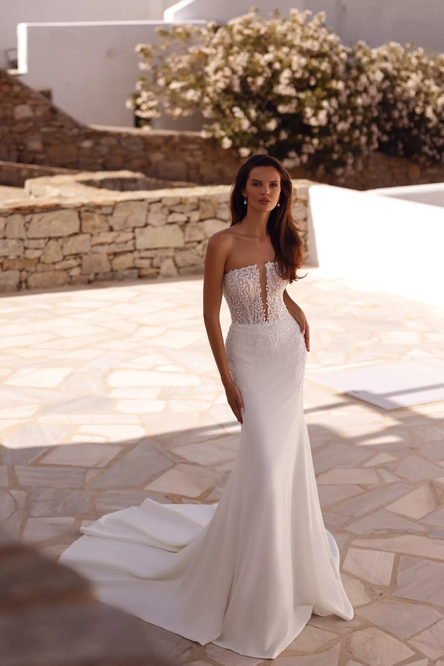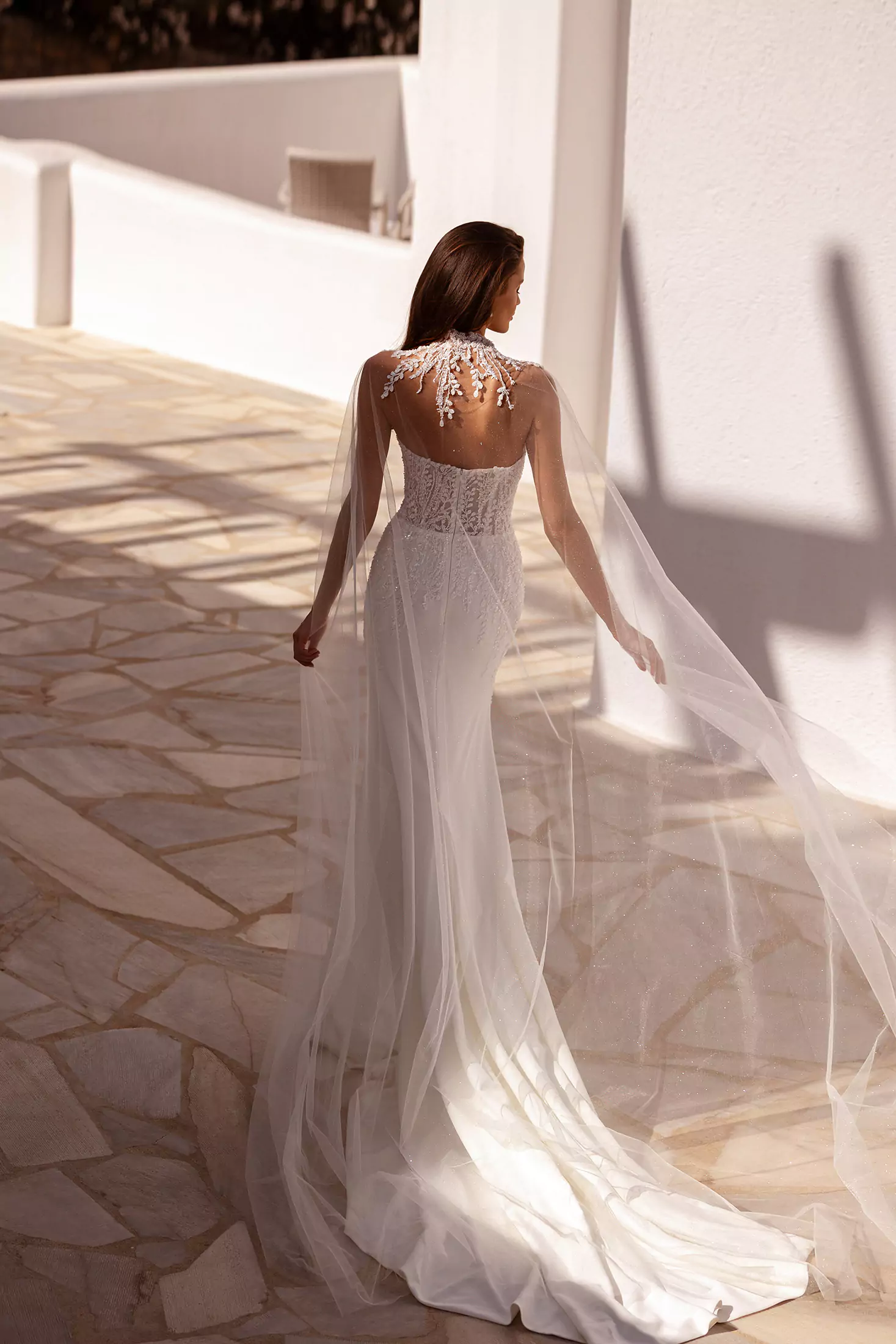 The Venetta style is a true showstopper. This wedding dress features a strapless, semi-sheer straight neckline bodice exquisitely crafted in beaded lace, creating a delicate and shimmering effect. The intricate lace seamlessly transitions into a fitted crepe chiffon skirt, enhancing the bride’s silhouette with its smooth, elegant drape. What sets this gown apart is its stunning glitter cape draped over the shoulders, adding a touch of sparkle and drama to the ensemble. The cape elegantly flows behind the bride, catching the light and creating a mesmerizing effect as she moves. To complete the look, pair it with a matching veil, adding a touch of classic sophistication to this stunning look.